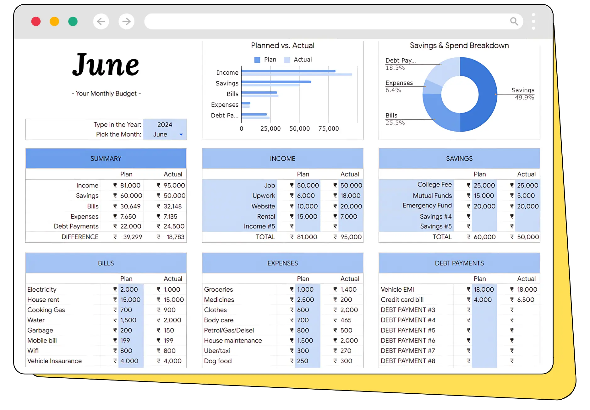 Get a full breakdown of your planned vs. actual spending, savings, income, bills, expenditures, and debt payments. This overview helps you understand your financial status at a glance.