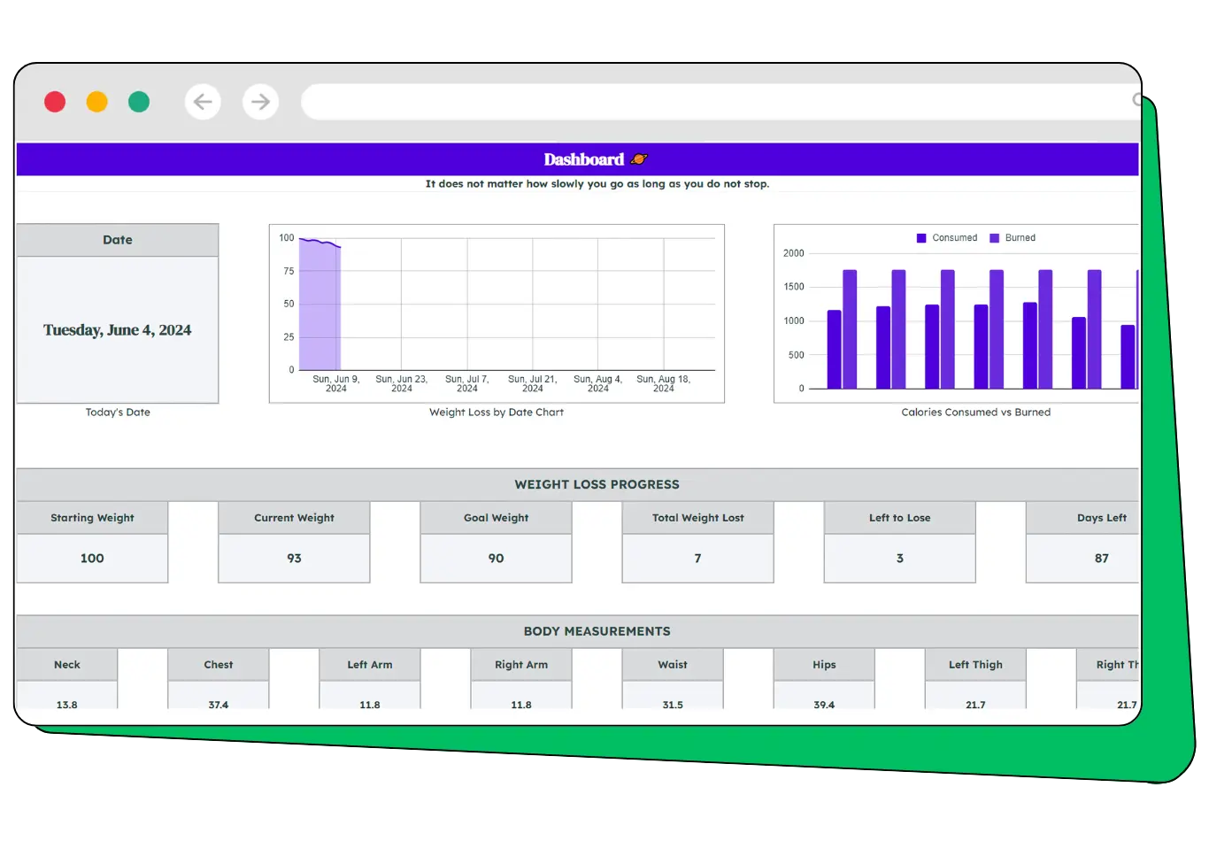 Set your starting date, goal date, and preferred units (such as pounds or kilograms). From there, the Weight Loss Tracker handles all the calculations automatically.