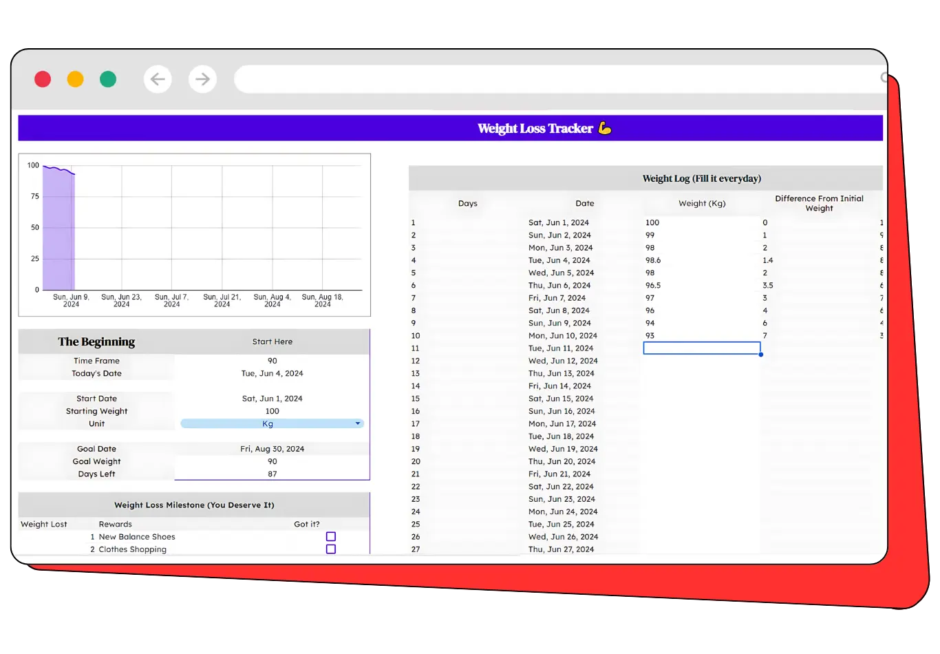 Simply input your daily weight, and the tracker will do the rest. It calculates the difference from your initial weight and your goal weight, keeping you informed and motivated.